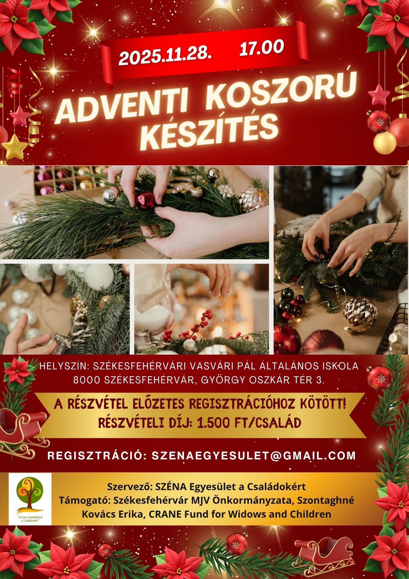 Egyesületünk idén is megrendezi hagyományos Adventi készülődését, ahol a család elkészíti saját Adventi koszorúját. A program résztvevőit zsíros kenyérrel és meleg teával várjuk.